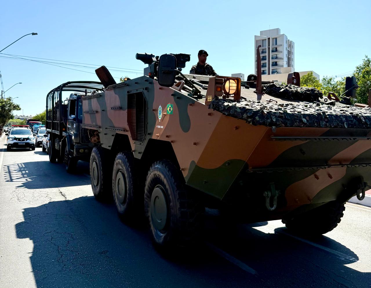 A abertura do cortejo foi feita pelo Exército Brasileiro, seguida pela Associação dos Veteranos das Forças Armadas (AVEFAR), Polícia Militar, Corpo de Bombeiros Militar e pela Secretaria Municipal de Segurança Pública, que levou para a avenida a Guarda Municipal, a Guarda Patrimonial, a Defesa Civil e os alunos formados pelo projeto Pequenos Defensores.