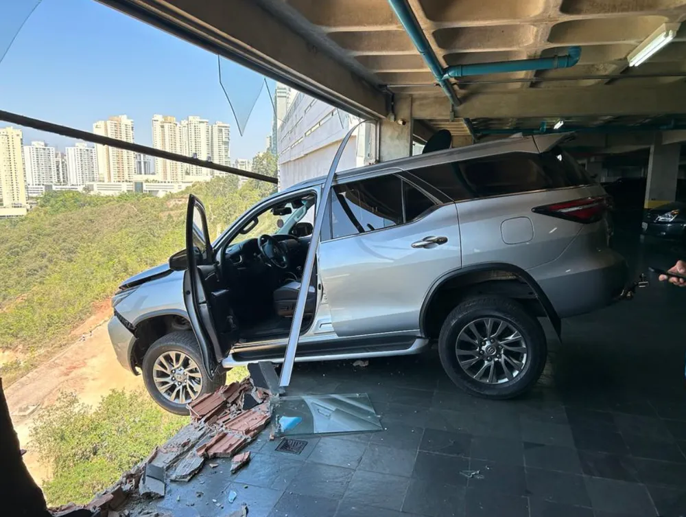 Um veículo de luxo modelo Toyota SW4 quase caiu do alto de um prédio em Nova Lima, Região Metropolitana de Belo Horizonte, em Minas Gerais, no último sábado (23).