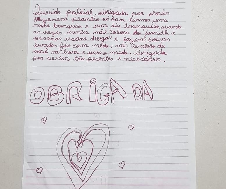 Policiais de uma unidade em Governador Valadares, no Leste do estado, foram surpreendidos com carta no mínimo inusitada. A garota Beatriz Evangelista Ferraz, de 9 anos, agradeceu os militares pela proteção que têm dado à população mineira. “Querido policial, obrigada por vocês fazerem plantão só para termos uma noite tranquila”, diz um trecho do texto.