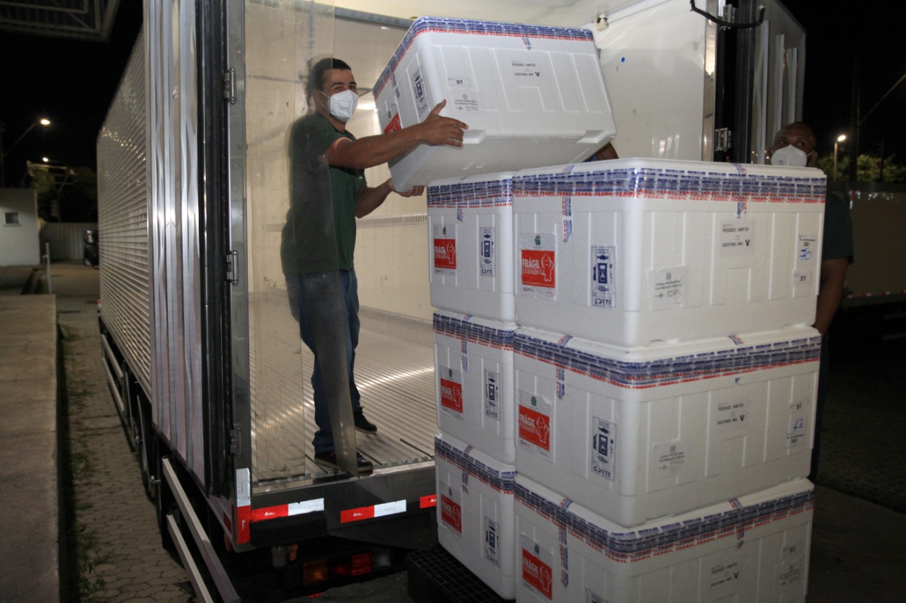 Os imunizantes chegaram à Central Estadual de Rede de Frio por via terrestre.