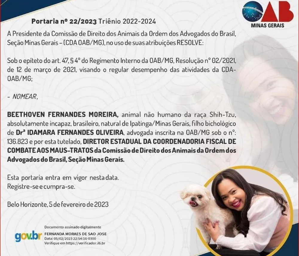 Um cachorro da raça shih-tzu, de três anos, foi nomeado pela seccional de Minas Gerais da Ordem dos Advogados do Brasil (OAB-MG) para o cargo de “diretor-fiscal de combate aos maus tratos”. A nomeação foi assinada pela advogada Fernanda São José, presidente da Comissão de Direito dos Animais da OAB-MG.