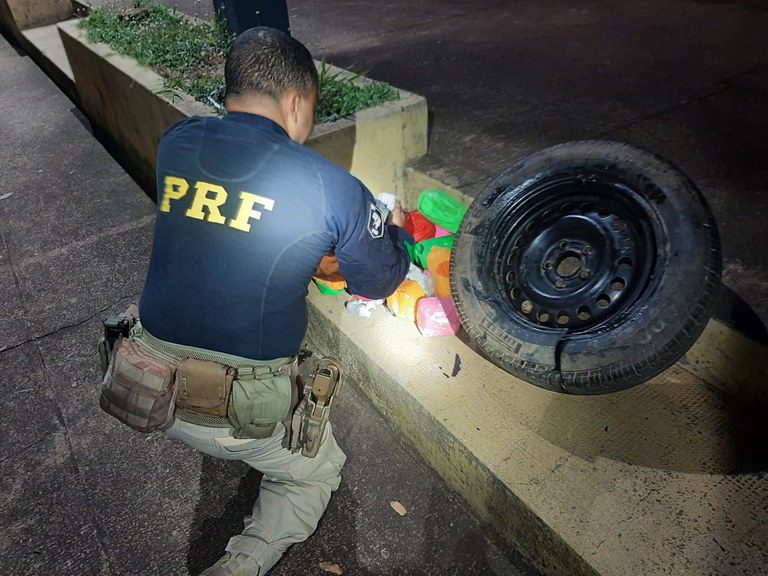 A equipe abordou um Fiat Cronos com placa de Sete Lagoas (MG), após perceber o nervosismo do condutor, de 59 anos, e as informações contraditórias que ele forneceu sobre a viagem. Durante a inspeção dos equipamentos obrigatórios, os policiais notaram que o pneu estepe estava com peso acima do normal.